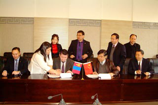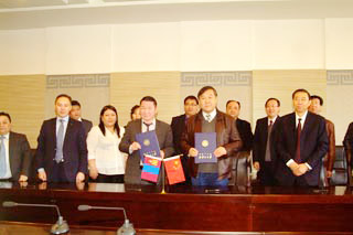 | 蒙古國執(zhí)行機(jī)構(gòu)汽車運(yùn)輸局副局長納?普恩查格(前排左三) 學(xué)校副校長齊木德道爾吉(前排右二)學(xué)院院長柴金義(前排右一)簽署協(xié)議 | 合影 |