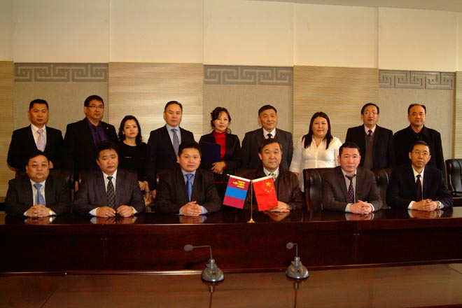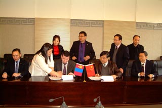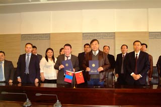 蒙古國(guó)執(zhí)行機(jī)構(gòu)汽車運(yùn)輸局副局長(zhǎng)納•普恩查格(前排左三) 學(xué)校副校長(zhǎng)齊木德道爾吉(前排右二)學(xué)院院長(zhǎng)柴金義(前排右一)簽署協(xié)議