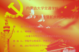 2012年6月29日下午,交通學(xué)院在交通樓A351會議室舉辦慶祝建黨91周年專題講座暨擴(kuò)大的中心組學(xué)習(xí)會,邀請內(nèi)蒙古大學(xué)公共管理學(xué)院政治理論部副主任傅鎖根博士作了題為《中國共產(chǎn)黨自身建設(shè)的歷史及啟迪》的專題講座。 學(xué)院院長柴金義 公共管理學(xué)院政治理論部副主任傅鎖根博士 學(xué)院常務(wù)副院長董平 學(xué)院黨委副書記、紀(jì)委書記白托婭 學(xué)院副院長孫恒 會場 會場 會場 會場 會場 會場 會場