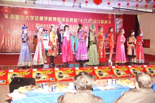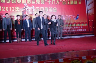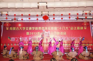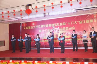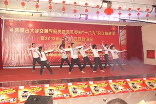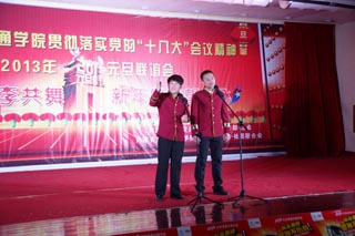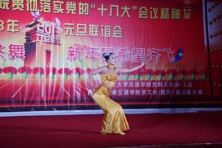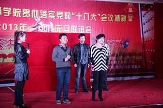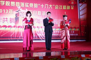 黨委副書記、紀委書記白托婭致新年賀詞。白書記代表全院領導班子向辛勤的貢獻在教學、科研、管理和服務一線的全體教職員工及全院朝氣蓬勃的青春學子們致以新年的問候和祝福。她說道,2012年是非比尋常的一年,我們的黨勝利召開了十八次代表大會,選舉產生了新一屆中央領導集體。我們院也在全院師生的齊心協(xié)力下,我們的檢測中心終于喜獲了交通部甲級資質。最后還向為了這臺晚會付出所有智慧和辛勞的老師和同學們致以感謝!