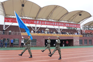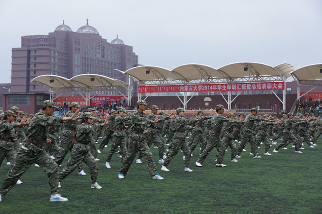 9月12日上午8:00,內(nèi)蒙古大學2014年學生軍訓匯報暨總結表彰大會伴隨著整齊劃一的步伐、振奮人心的軍歌,在北校區(qū)和南校區(qū)同時舉行。
