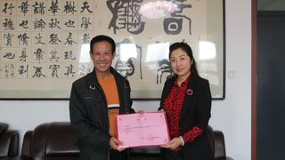 學(xué)院黨委副書(shū)記、紀(jì)委書(shū)記白托婭(右)向特邀黨建組織員白文生(左)同志頒發(fā)聘書(shū) |