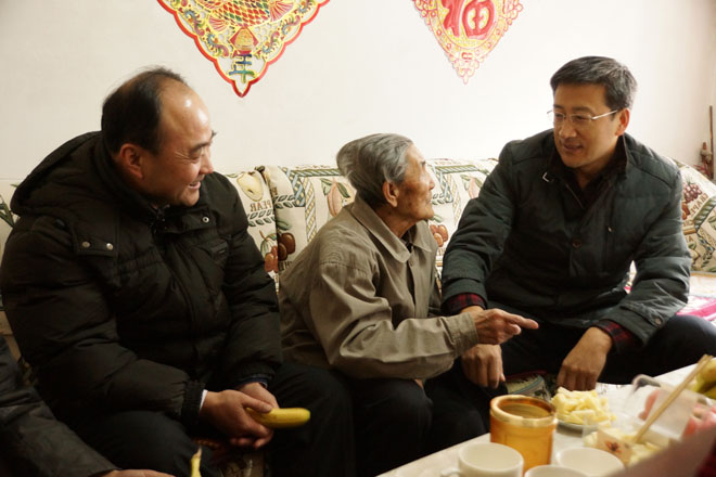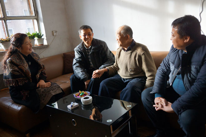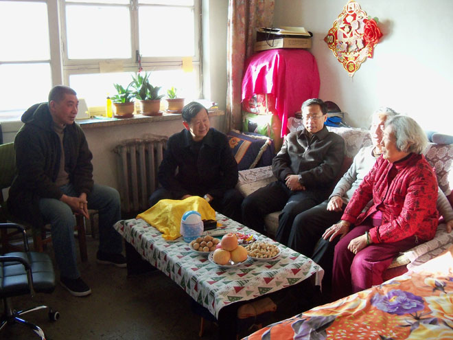 學(xué)院院長(zhǎng)柴金義(左二),黨委副書(shū)記、紀(jì)委書(shū)記白托婭(左一)慰問(wèn)離休干部李成柏(左三)同志 |