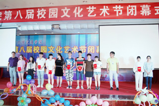文藝表演共分為兩個篇章,第一篇章“青春交響,綻放華麗激情” ——歌曲 《我的舞臺》、特色舞蹈《康定情歌》、豪放大氣T臺秀《超級T臺秀》、感人肺腑的朗誦《社聯(lián)十年 風(fēng)華正茂》以及第二篇章 “最美年華,譜寫動人樂章”——優(yōu)美歌曲 《母親河》、武術(shù)表演《中國功夫》、民族歌曲《我的朋友》以及《文化藝術(shù)節(jié)活動展播》。這些文藝節(jié)目主題鮮明,分別展示不同特色,為本屆校園文化藝術(shù)節(jié)畫上了圓滿的句號。在晚會現(xiàn)場還進(jìn)行了2015年度十佳社團(tuán)評比頒獎活動,獲得優(yōu)秀社團(tuán)的有:追星羽毛球社、宏武協(xié)會、博弈棋牌社、領(lǐng)先電子競技社團(tuán)、乒乓球愛好者協(xié)會、嘻哈舞樂天社團(tuán)、微塵志愿者協(xié)會;榮譽(yù)社團(tuán):足跡文苑、墨緣書畫社、炫酷E族漂移社;標(biāo)兵社團(tuán):瘋狂英語協(xié)會、旋風(fēng)劇團(tuán)、暢翔輪滑社,現(xiàn)場嘉賓為獲獎社團(tuán)頒獎留念。