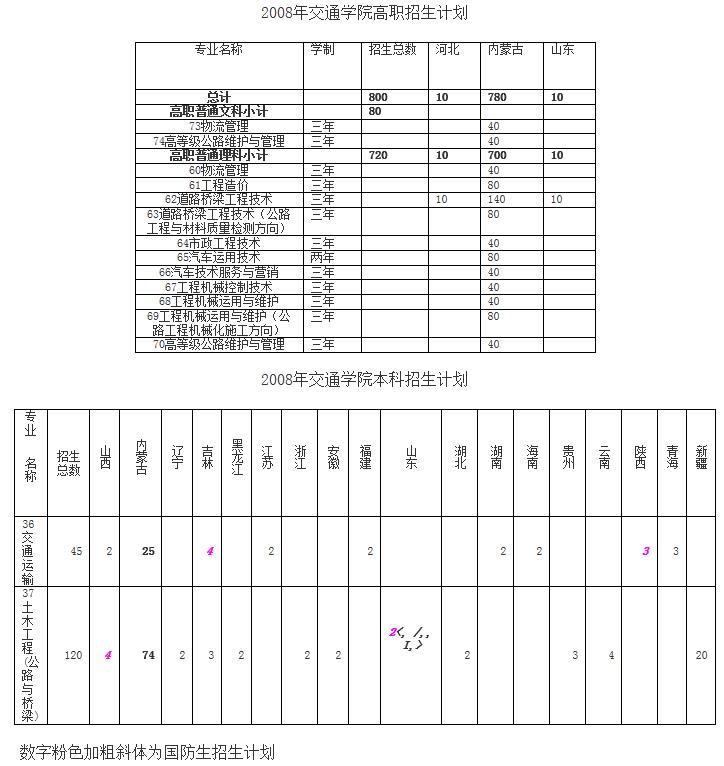 2008年交通學(xué)院本科、高職招生計(jì)劃