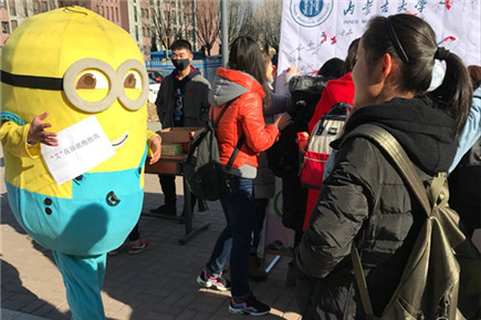 學(xué)生們統(tǒng)一著裝,系上紅絲帶,扮上卡通萌娃形象,通過(guò)學(xué)生擁抱、握手、現(xiàn)場(chǎng)簽名、知識(shí)展板、宣傳資料發(fā)放等活動(dòng)形式,從交通樓到學(xué)生餐廳,從主樓到宿舍樓,同學(xué)們和萌娃一路簇?fù)怼⒁宦沸麄?,向南校區(qū)學(xué)生廣泛宣傳艾滋病的傳播途徑、如何預(yù)防以及如何對(duì)待艾滋病患者的知識(shí)。