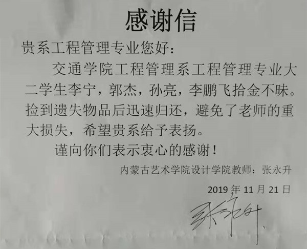 11月21日上午,工程管理系黨總支收到了藝術(shù)學(xué)院張永升老師送來的感謝信,感謝高管31班李明、霍杰、孫亮、李鵬飛四位拾金不昧、熱心助人的好青年。