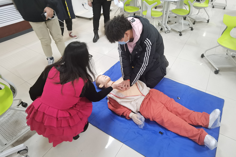 并就心肺復(fù)蘇的具體操作方法進(jìn)行了講解和示范,查看“患者”意識、觸摸頸動脈、清除呼吸道異物、打開氣道、胸外心臟按壓、施行人工呼吸等。工作人員現(xiàn)場和師生進(jìn)行互動,部分師生在工作人員的指導(dǎo)下進(jìn)行了實(shí)操,初步掌握了心肺復(fù)蘇的基本技能。