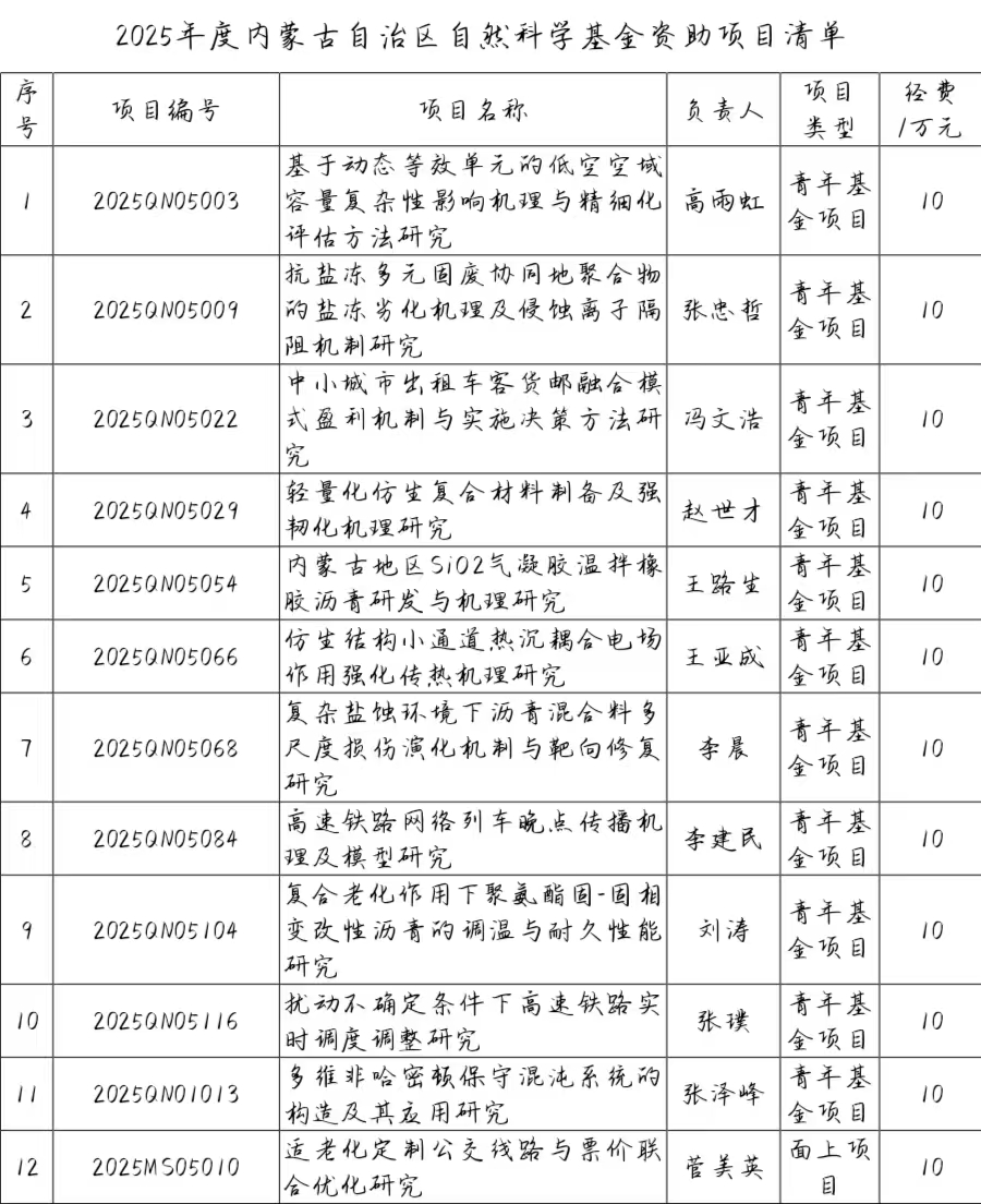 近日,內(nèi)蒙古自治區(qū)科學技術(shù)廳公布了2025年度內(nèi)蒙古自治區(qū)自然科學基金項目評審結(jié)果。我院共申報項目25項,最終獲批22項,項目獲批率達88%。其中,青年基金項目11項,面上項目9項,聯(lián)合基金項目2項,總資助金額達206萬元。在項目數(shù)量和資助額度方面均實現(xiàn)了新的突破,體現(xiàn)出我院在科學研究與科技創(chuàng)新能力方面的持續(xù)提升與進步。獲批項目清單如下。